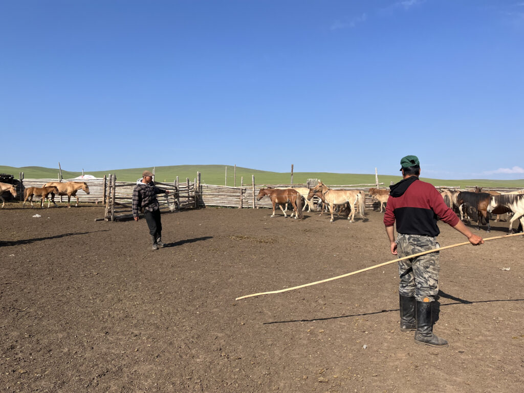 朝一番、僕たちは自分たちがこれから乗る馬たちが集められている飼育所へ向かいました。 そこでは、遊牧民の方々が実際に乗馬用の馬を捕獲する様子を間近で見ることができました。