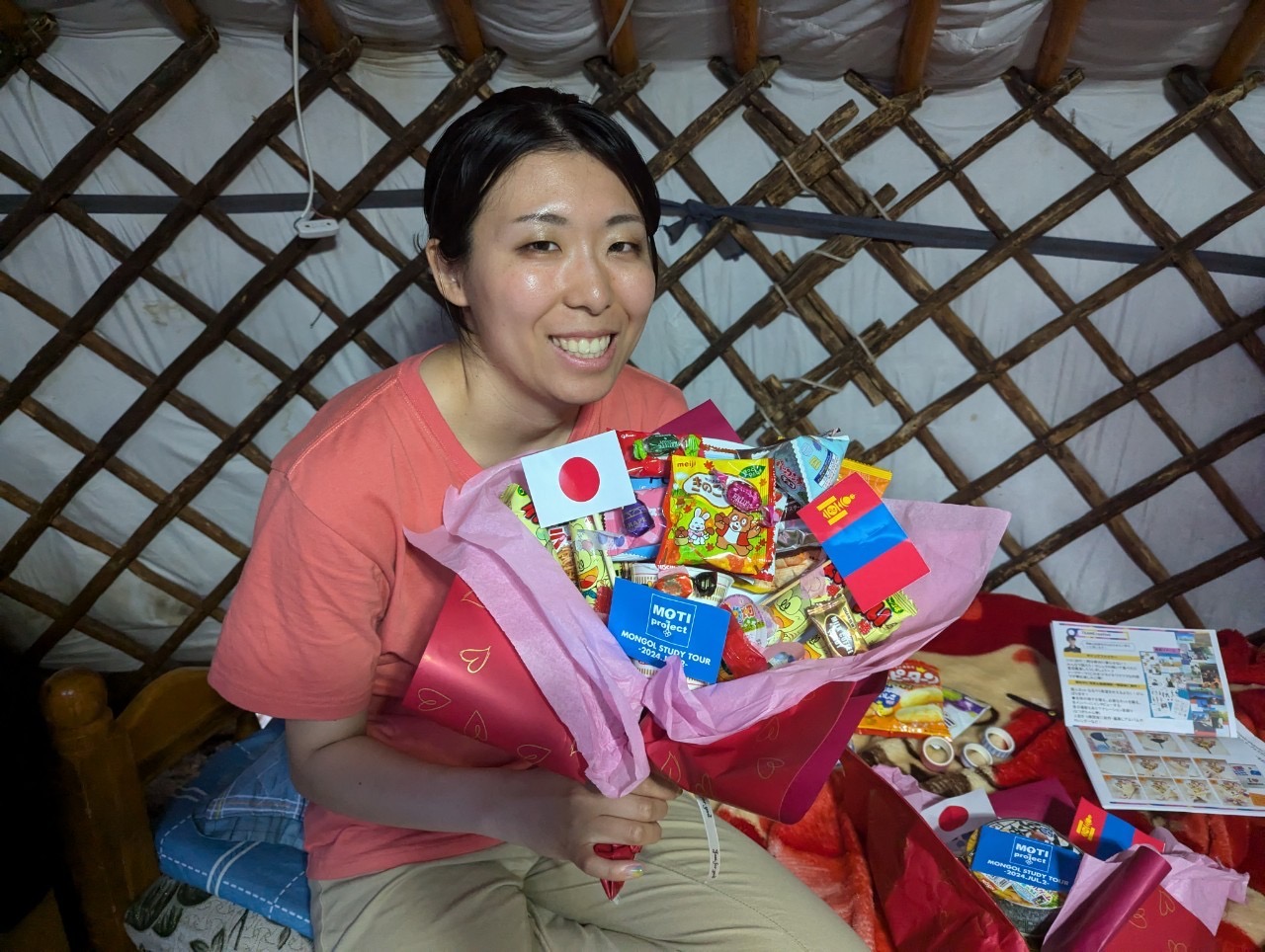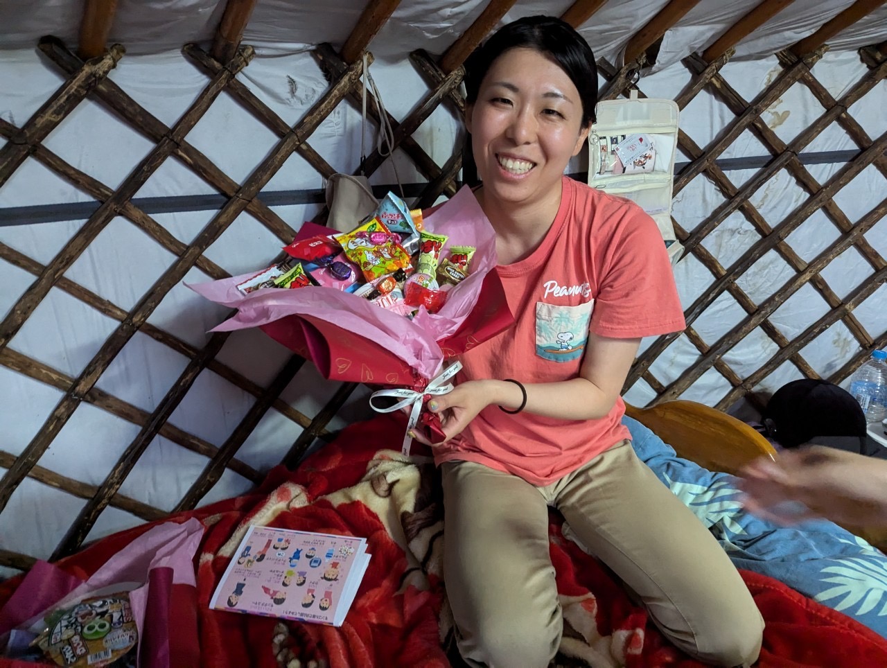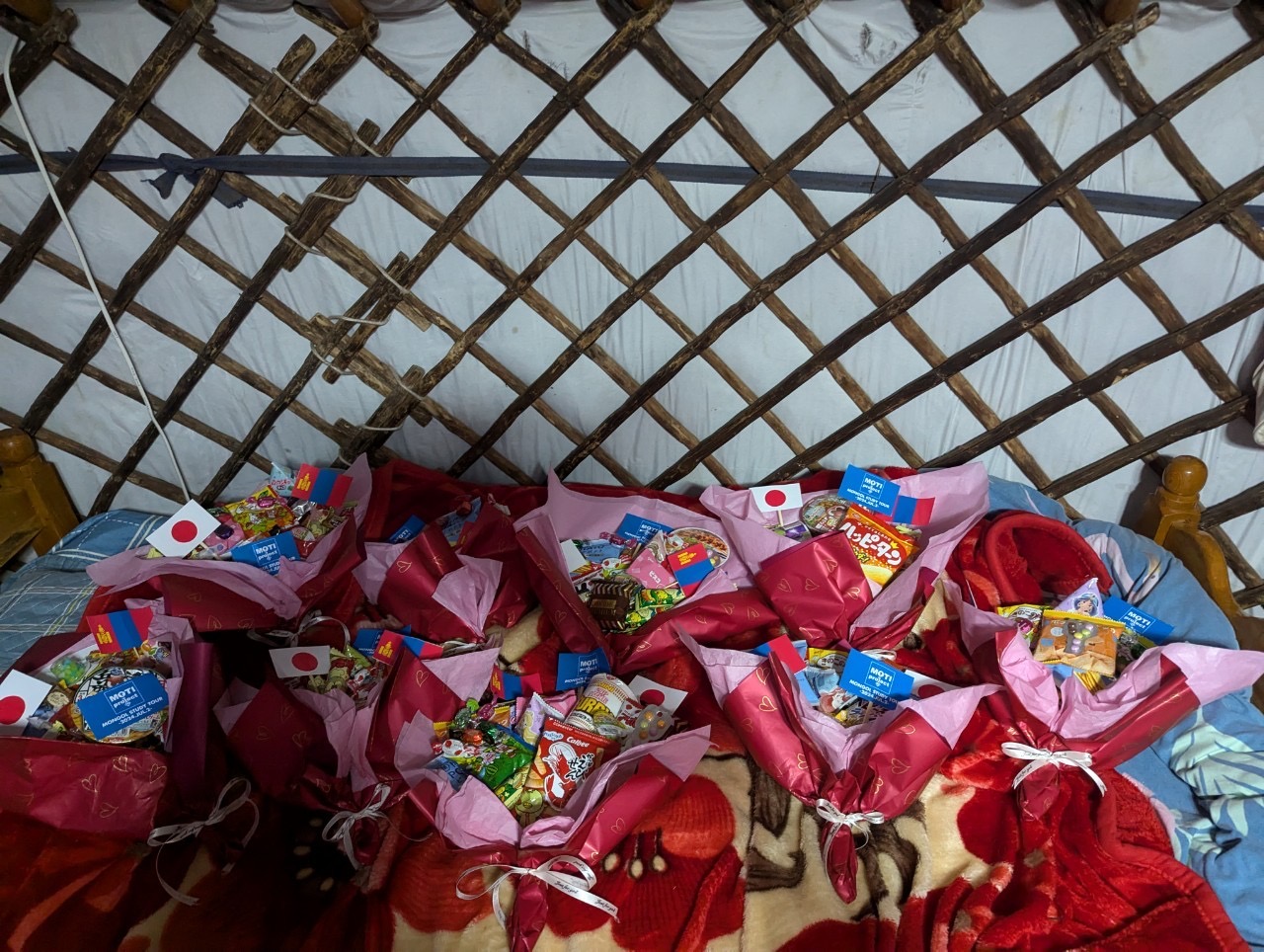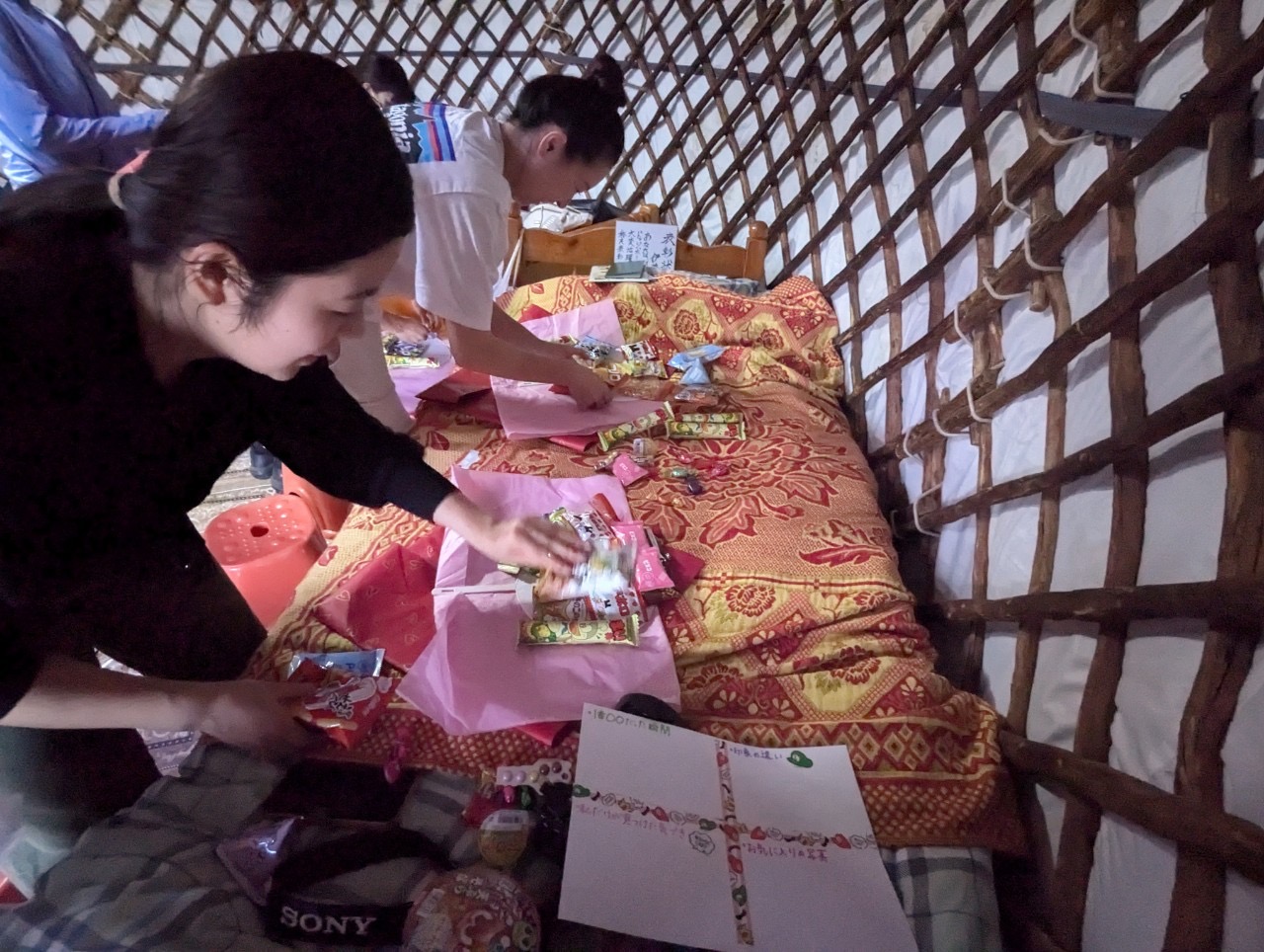 この日は、遊牧民の方々へのサプライズも! 日本から持参した小分けのお菓子をウチワに貼り付けて、 手作りの“お菓子プレゼント”を用意しました🎁