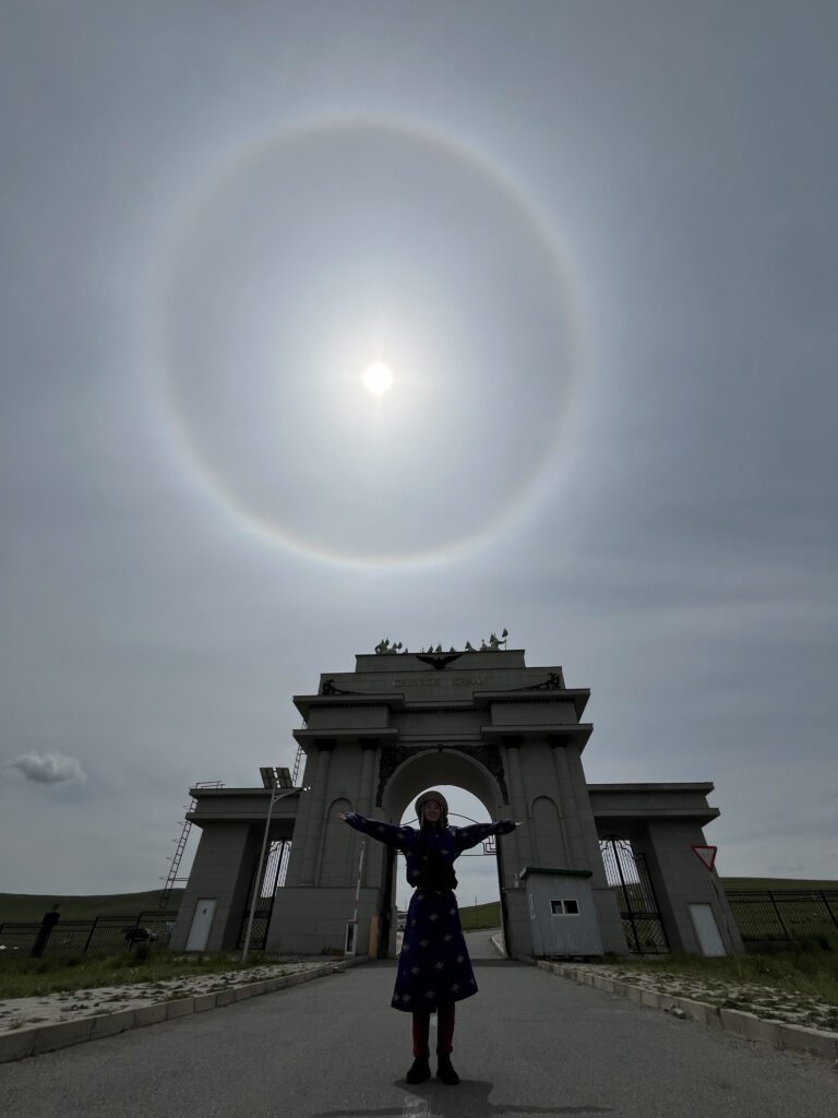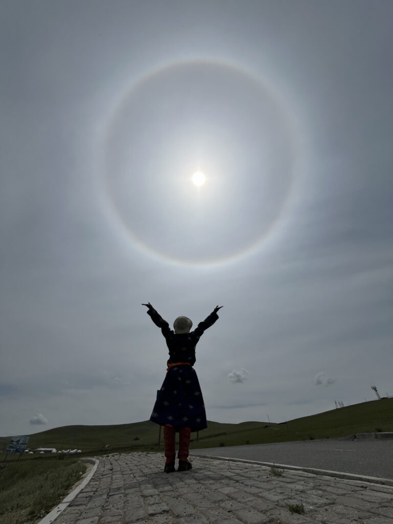 目的地に近づいたころ、上空を見上げると太陽の周りに丸い虹が! これは“ハロ現象”と呼ばれる自然現象で、雲の中の氷の粒が太陽光を反射してできるそう。 空の芸術を背景に、みんなで思わず写真撮影📸