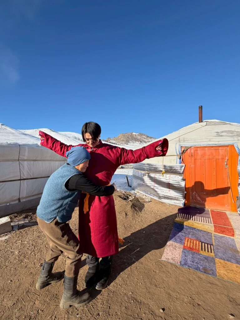 もともと着る予定はなかったのですが、ゲル前で写真撮影をメンバー同士で行っていたところ、自分がお世話になっていたゲルの遊牧民の方が「着てみな!」と言ってくれて、ご厚意で着せていただきました!