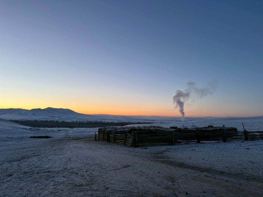 7時頃、トイレのためにゲルの外へ出ると、日本なら明るくなり始めている時間ですが、12月末のモンゴルはまだ薄暗かったです。
