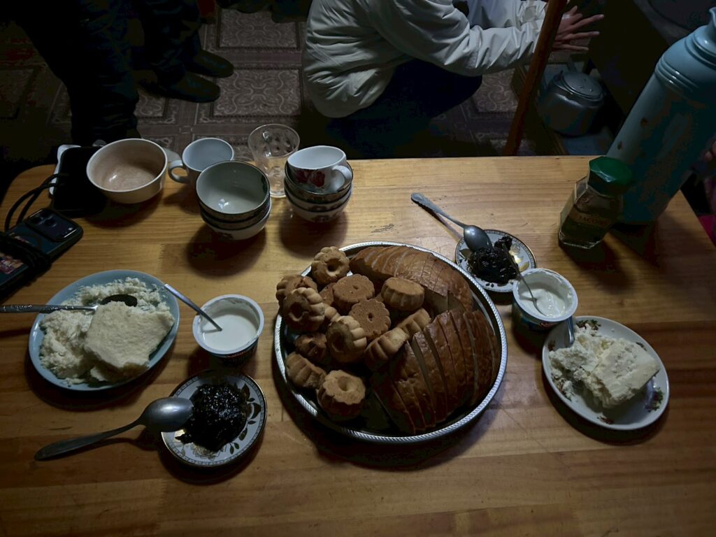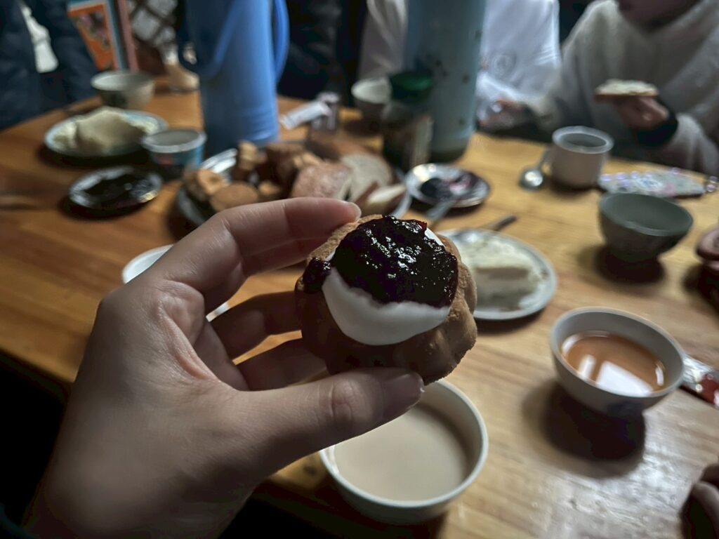 パンに山羊のミルクを固めたものを乗せて食べて、一緒にミルクティーを飲めば、冷え切った体がじわっと温まってほっこりします。