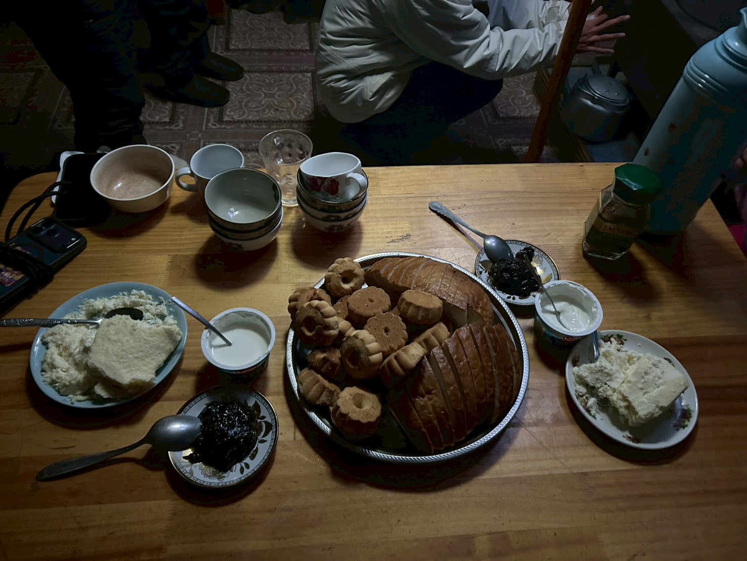朝ごはんは、遊牧民のお母さんが作ってくれた温かいミルクティーとパンでした。